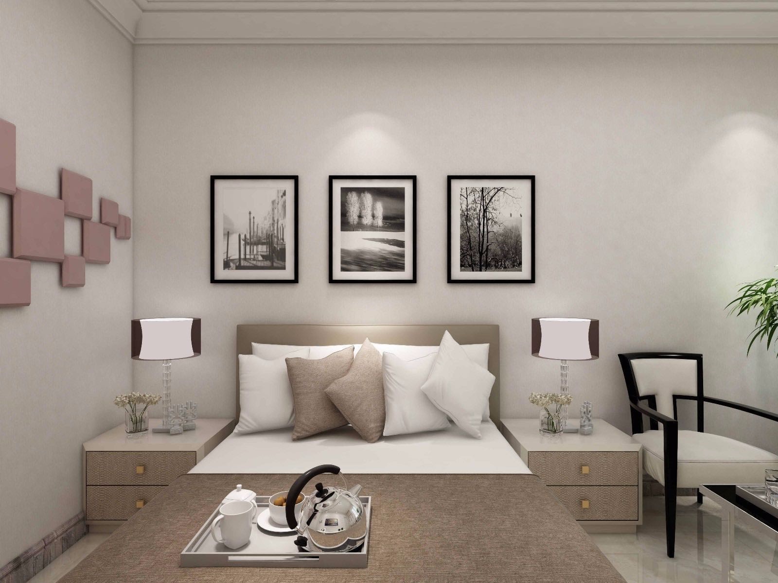 主臥,延續白+木基調,用吊燈,窗簾,地毯為空間添彩,打造出清新自然的舒適環境。