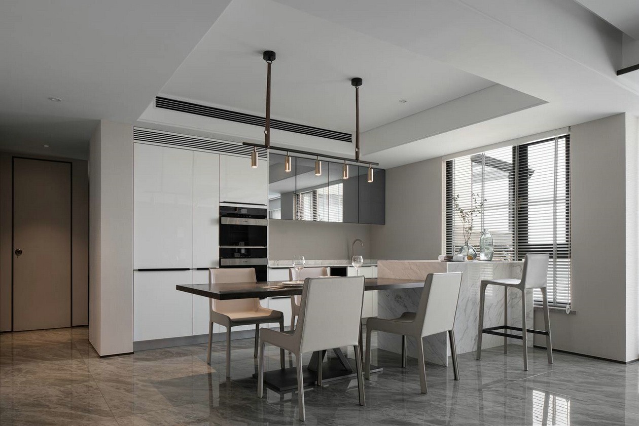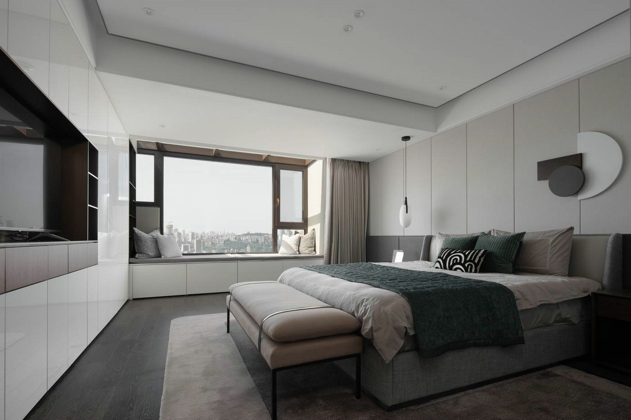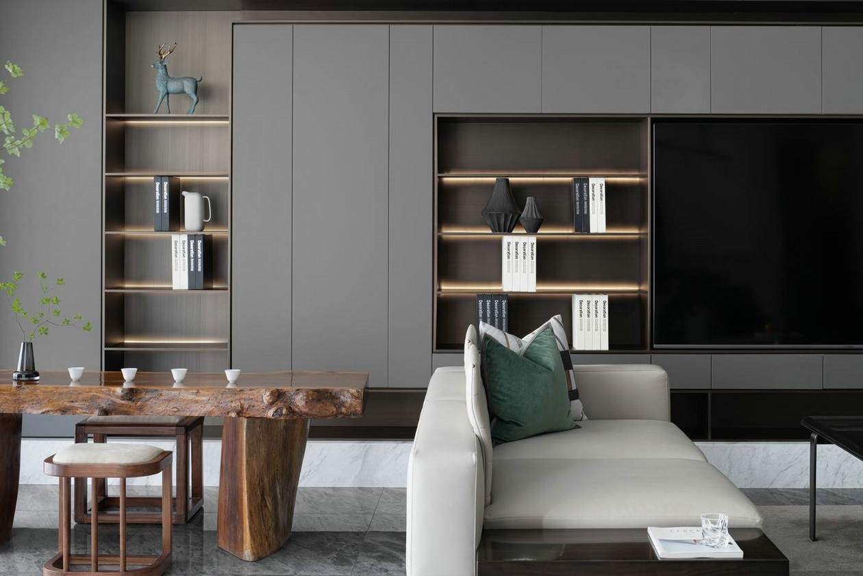 客廳茶室一體結(jié)合的做法,使空間體量有所增加,開闊的空間體驗(yàn)也在無(wú)形中影響著業(yè)主的生活模式。